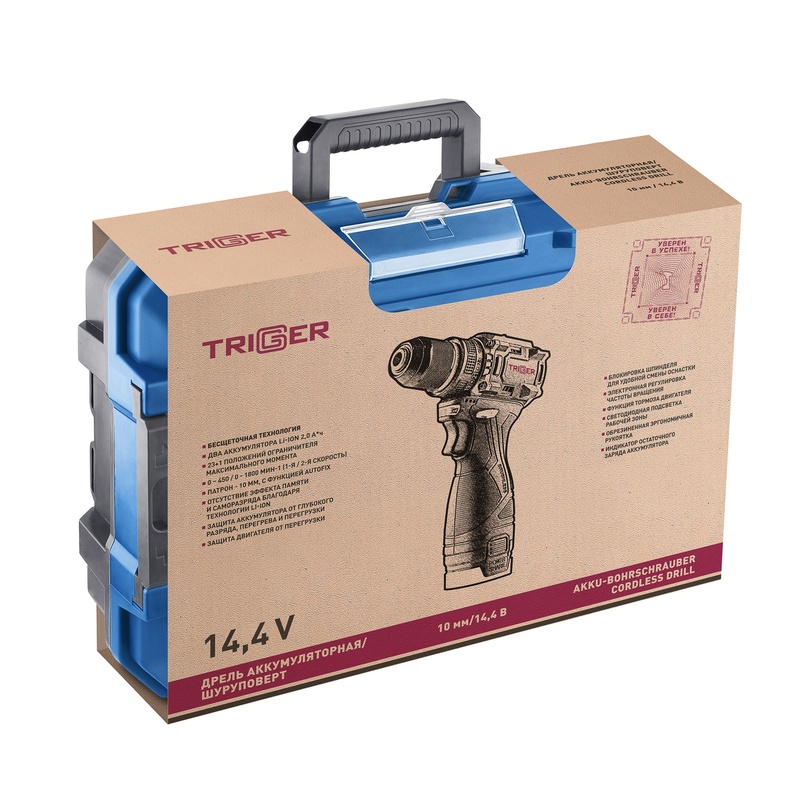 Дрель-шуруповерт Trigger 20130, бесщеточная, 14,4V, 10 мм, 48 Нм, 2 аккумулятора Li-ion (2Ач), кейс