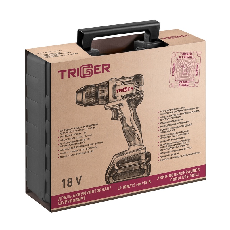 Дрель-шуруповерт Trigger 20111, бесщеточная, 2 аккумулятора Li-ion (2Ач), 18V, 13 мм, 72 Нм, кейс в Орехово-Зуеве
