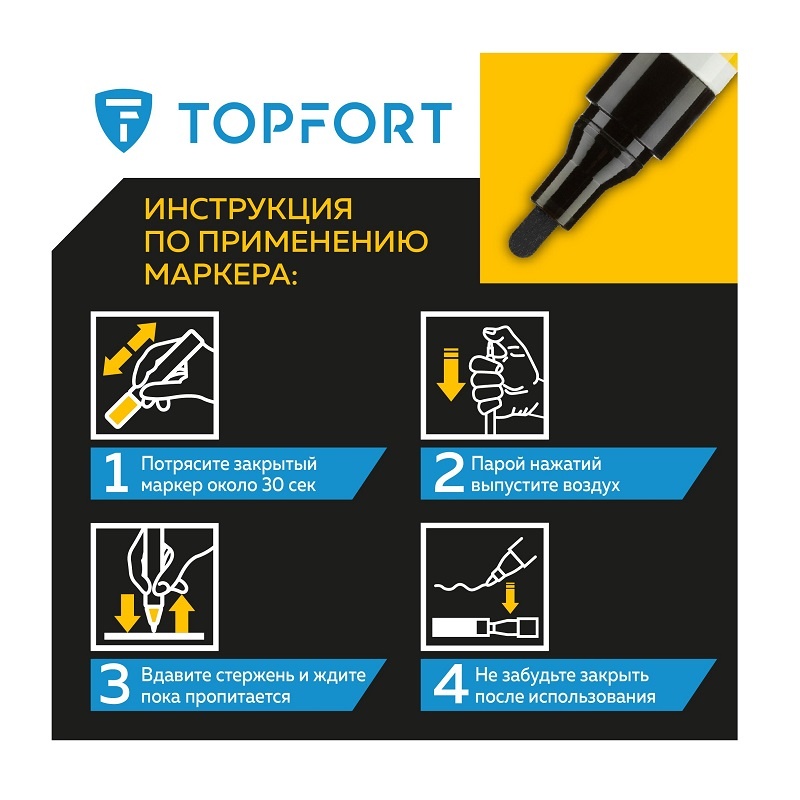 Предостережения: плотно закрывайте колпачок после применения, держать маркер вдали от источников тепла и воспламенения.
