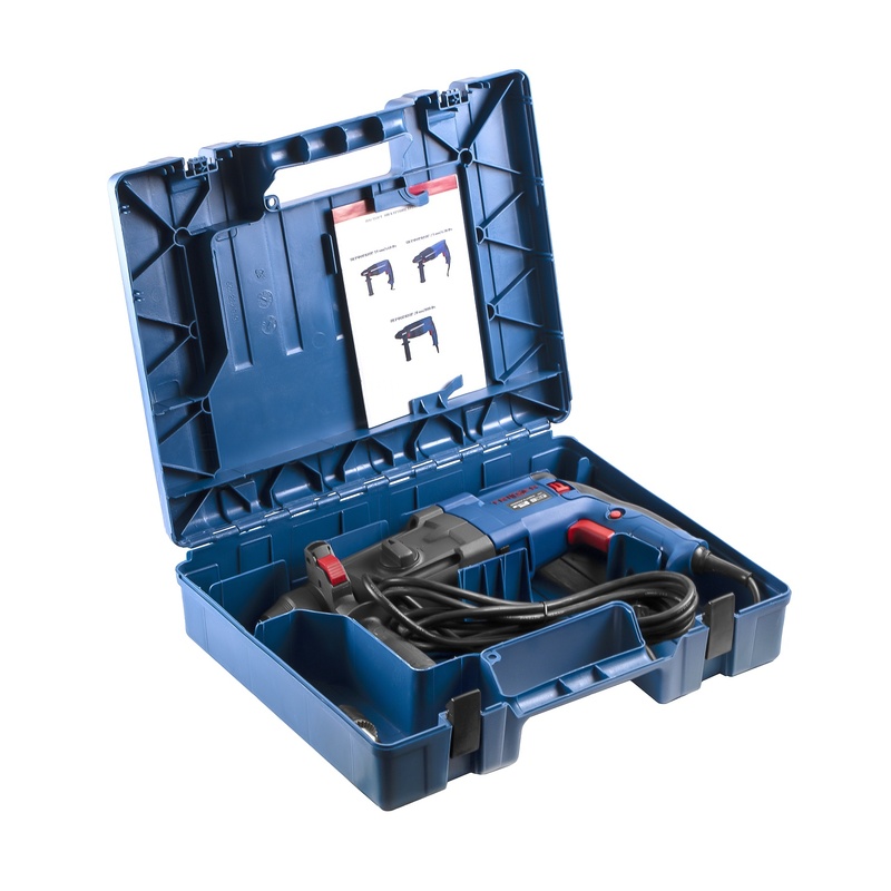 - В комплекте: переходник SDS+, цилиндрический патрон с ключом, дополнительная рукоятка, ограничитель глубины сверления, запасные щетки, пластмассовый кейс.