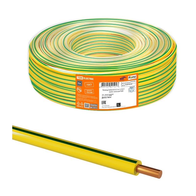 Провод ПуВнг-LS (ПВ-1) 1х1,5 мм², желто-зеленый (1 п.м.) ГОСТ 31947-2012