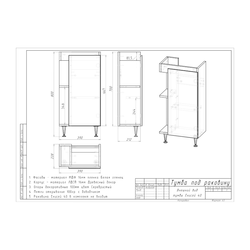 Тумба для ванной комнаты SKS Енисей 40, 390х700х216 мм
