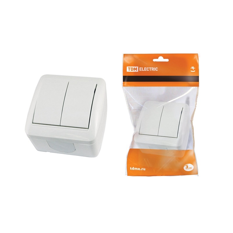 Выключатель о/у Селигер SQ1818-0002, 2 клавиши, б/инд, IP44, белый